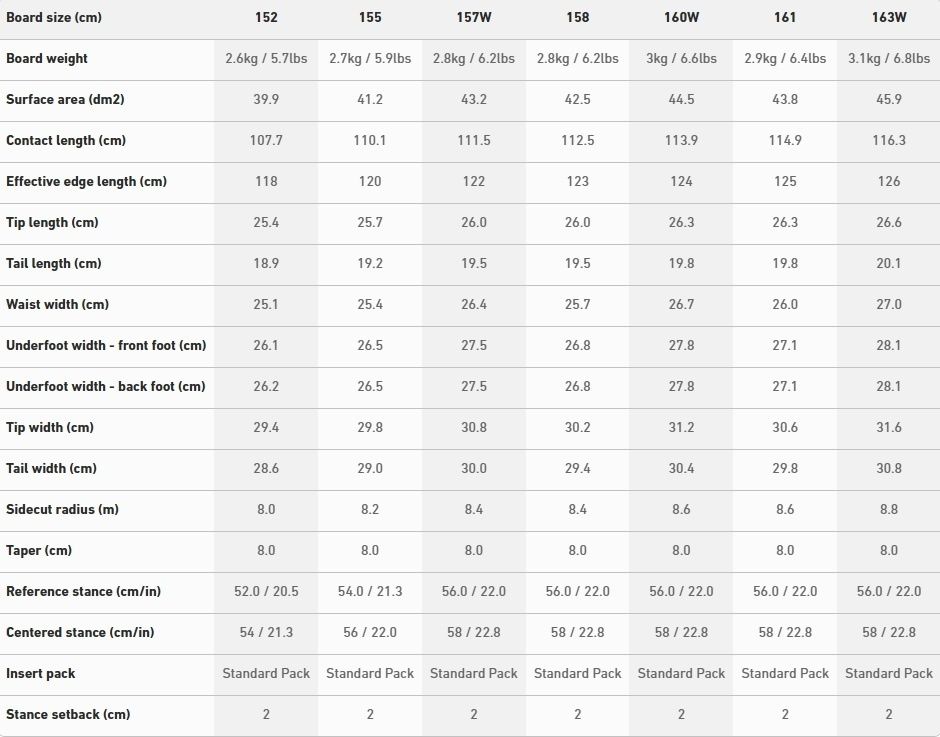 Board size (cm) | 152 | 155 | 157W | 158 | 160W | 161 | 163W |
