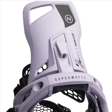 Nidecker heeft de Supermatic gebouwd met behulp van beproefde materialen die in de hele lijn te vinden zijn. De gloednieuwe baseplate is gemaakt van gevuld nylon, met een Slip-N-Grip plaat die je teen helpt om over de pad te glijden om het instappen nog gemakkelijker te maken. Evenzo heeft Nidecker een roller aan de hielcup toegevoegd voor een soepele werking van de hiback-trigger. Ten slotte is de nylon Asym Hadron hiback ontworpen voor een perfecte pasvorm, met een responsieve flex en een geïntegreerde forward lean-afsteller voor volledige aanpassing.